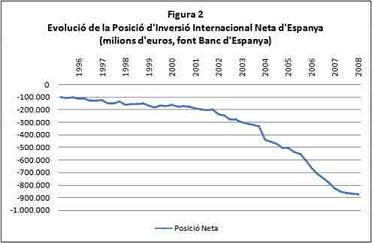 Figura 2 mostra com ha evolucionat la posició neta d’Espanya des de l’any 1996. És la diferència entre el que la resta de països del món li deu a Espanya i el que Espanya deu a la resta del món. La posició neta internacional d’Espanya ha passat de-99.089 milions d’euros a l’acabar el primer trimestre de 1996 fins a -876.096 milions d’euros a l’acabar el quart trimestre de 2008. Ha augmentat l’ocupació, sí, però hem passat d’un deute net a l’exterior de 6.042€ per cada persona activa el primer trimestre de l’any 1996 a un deute de 37.926€ el quart trimestre de l’any 2008. Està clar doncs que, independentment de les hipoteques subprime als EEUU, dels actius tòxics als balanços dels bancs americans, dels abusos comesos per bancs d’inversió, dels NINJA, etc., la situació a Espanya havia d’acabar com ha acabat: